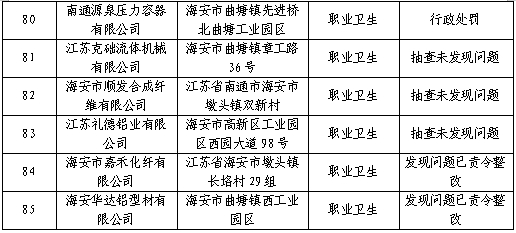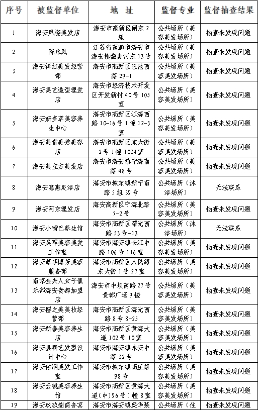 根據國家疾控局綜合司、國家衛生健康委辦公廳和國家中醫藥管理局綜合司《關于印發2024年國家隨機監督抽查計劃的通知》(國疾控綜監督二函〔2024〕83號)、江蘇省衛生健康委員會《2024年江蘇省衛生健康隨機監督抽查實施方案》(蘇衛辦監督〔2024〕2號)、南通市衛生健康委員會《關于印發2024年南通市衛生健康隨機監督抽查實施方案的通知》(通衛監督〔2024〕4號)等要求,9月份,海安市衛生監督所開展了公共場所衛生、醫療衛生、傳染病防治和職業衛生等隨機監督抽查工作,現將抽查結果公示如下: